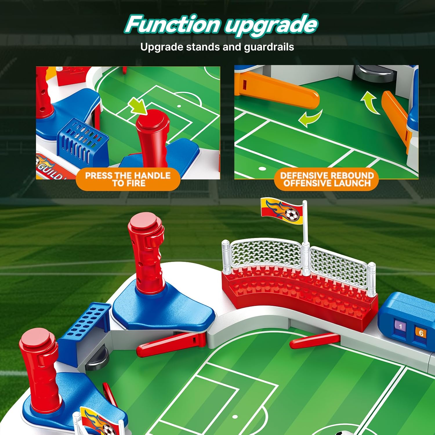- Real Stadium Action with Safety Fence: Equipped with a boundary fence and dual spring-loaded flippers, this mini foosball game lets kids pass, shoot, and defend just like in a real match. The design helps improve hand-eye coordination, reaction time, and focus—without needing batteries.