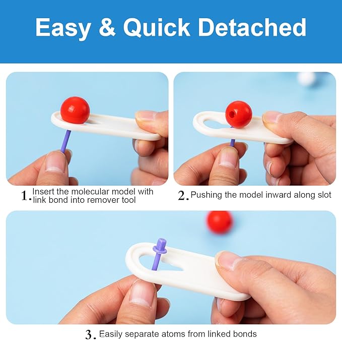 - Easy to Attached and Detached: The Chemistry molecular model set is designed for easy assembe molecules, make it accessible for users of all skill levels. The atoms, electron cloud orbitals, and bonds are designed to fit together seamlessly, allowing you to construct complex molecular structures with ease and the atoms remover tool making it effortless to disassemble and rearrange the models as needed. All the connective pieces insert smoothly and firmly and disconnect is the same fashion