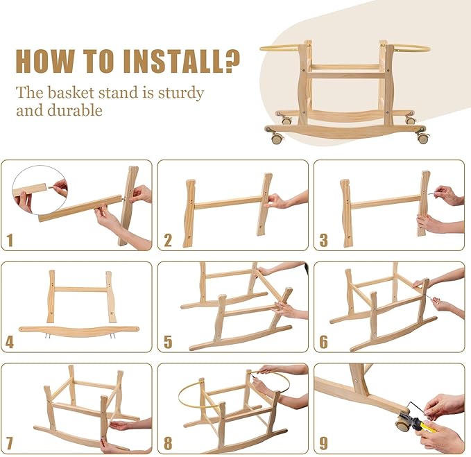 - Material: Bassinet Stand is made of selected wood, quality control from the source, all-round protection of the rocking chair frame structure of the solidity and durability, so that it is always stable and reliable in daily and long-term use, to bring peace of mind for the user's experience.