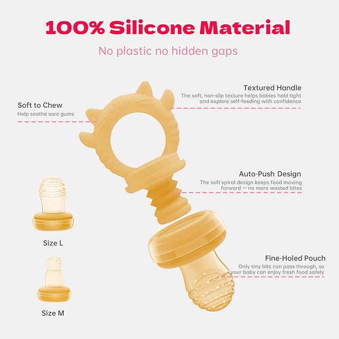 - [Easy to Clean] Thanks to Lori from our product team (and mom of two), this silicone feeder has an extremely simple structure. It has no complicated parts and can be completely disassembled, meaning there’s no place for food residues to hide. After each use, hand wash with warm, soapy water, or just let the dishwasher do it for you. Simple and quick!