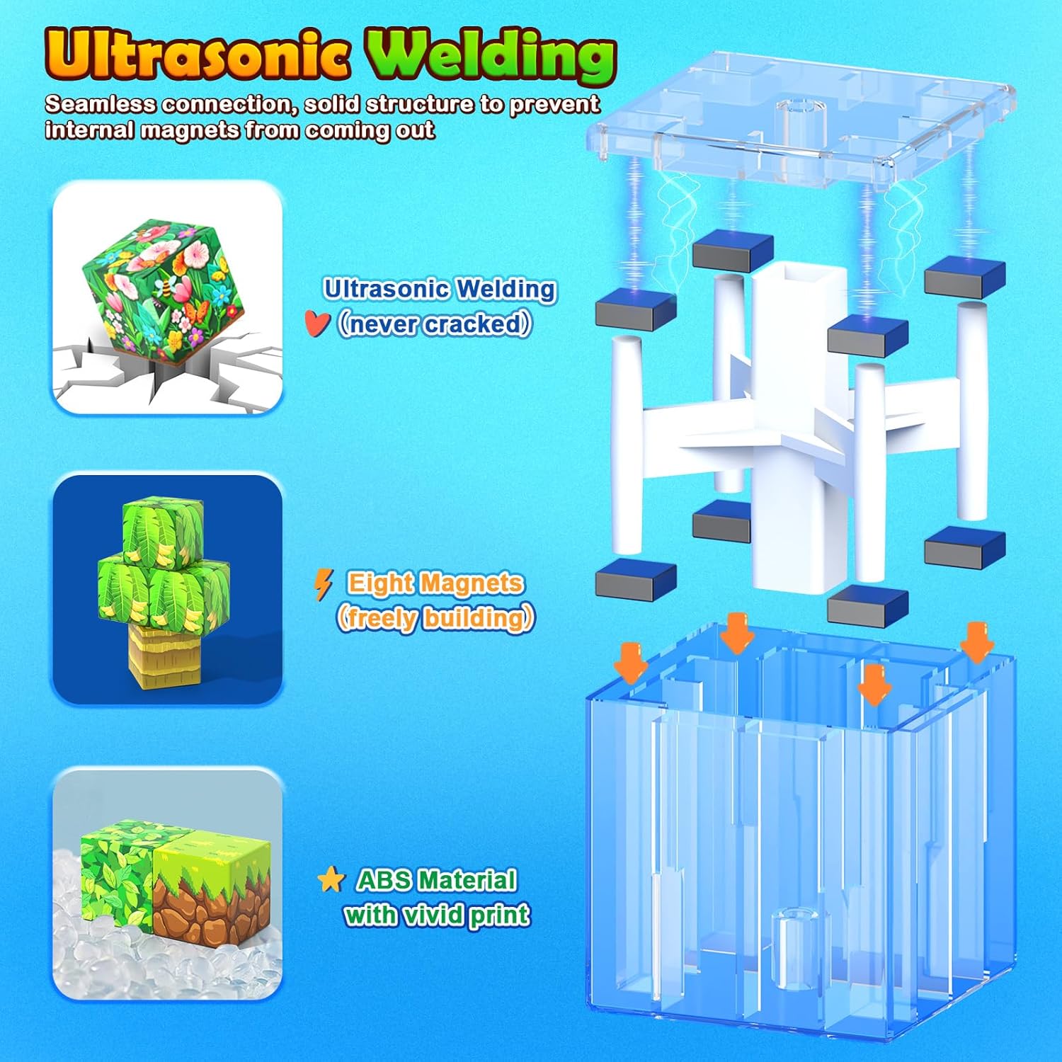 - 【Built to Last & Play Safe】Compared to commonly other magnetic building blocks, our mine magnet world magnetic blocks craft with advanced ultrasonic welding technology. This ensures seamless edges and a more stable structure, which prevents breakage, giving parents peace of mind when children use them. Each block contains 8 high-quality magnets, allowing it to stack firmly when attached to one side, making each cube both sturdy and flexible. Even 3-year-old kids can freely and easily use these magnetic blocks for building, rotating, dismantling, and rebuilding