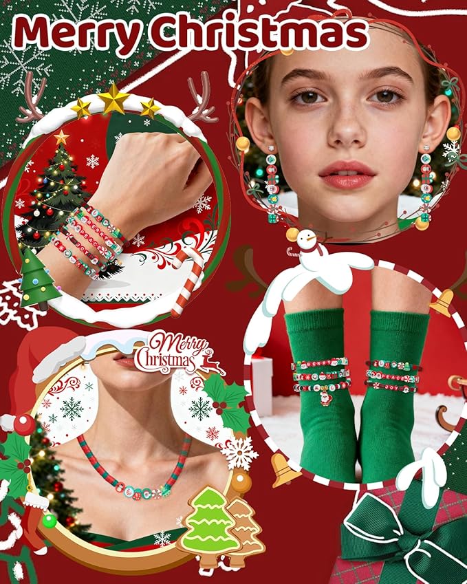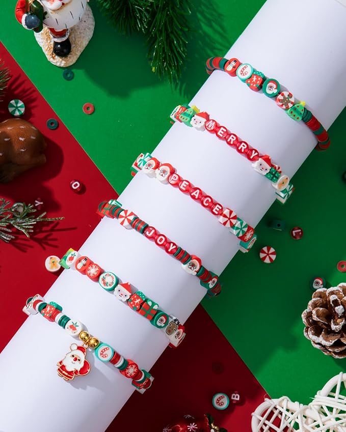 - 🎄 Complete Christmas DIY Beads Kit – Comes with 300 Christmas element polymer clay beads, 300 red and green clay beads, 80 red alphabet beads, and 1 roll of string. A festive mix of holiday colors and shapes gives you endless inspiration for jewelry making and Christmas crafts.