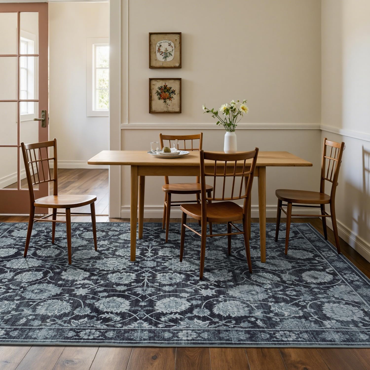 6x9 Area Rug for Living Room & Bedroom, Washable Non-Slip Vintage Distressed Rugs, Floral Soft Carpet, Low Pile Wool Carpets for Indoor Dining Home Office Playroom Under Table, Black