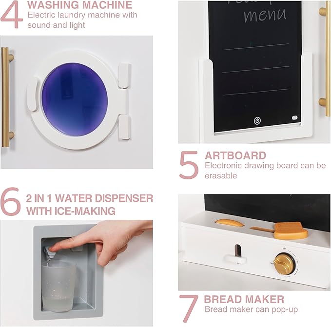 - Full kitchen set❗The large corner kitchen has been equipped with everything a little chef might need. In addition to an electric stove and microwave, it also has a oven, toaster, water dispenser, washing machine and tap. The child's fun will be enriched by the sounds and light signals emitted by the kitchen.