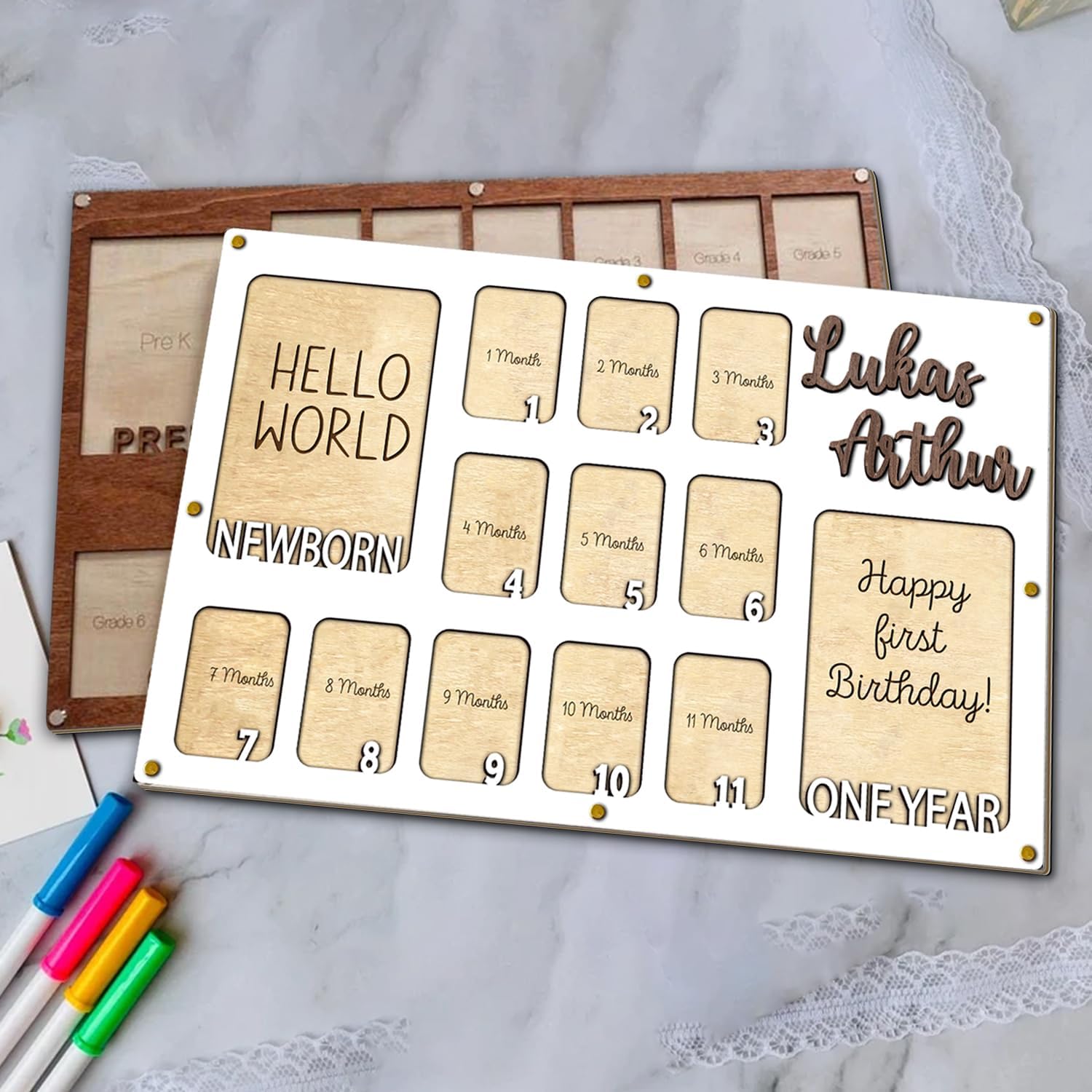 - Capture your baby’s first year with our babys first year photo frame. This baby first year photo frame helps you record their growth from newborn to one year, showcasing each milestone in a 12 month picture frame for baby first year. The wooden plaque includes space for your baby’s full name, making it a personalized keepsake. Our my first year photo board, one year photo board is a wonderful way to celebrate these moments, and the nursery picture frames add a special touch to any room.