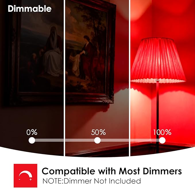 - Dimmable & High-Brightness: This red LED bulb is dimmable, compatible with most LED dimmers, no flicker or glare. Adjust brightness freely for reading, relaxing or sleeping to meet your needs. 9W 800 lumens, much brighter than 1W/3W red bulbs on the market, soft yet sufficient light—ideal for bedside lamps, bedrooms, bathrooms and pre-sleep spaces
