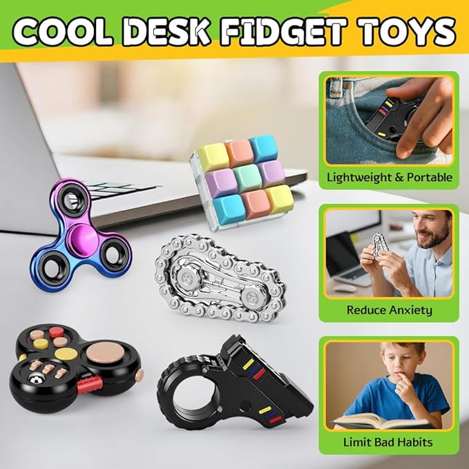 - Portable Supervalue Pack: Designed to withstand frequent use, these toys ( 5 pcs at total, fidget spinner, fidget slider, keyboard clicker toy, fidget pad, fidget chain)provide long-lasting entertainment. Perfect for use in the office, at school, or while traveling. It makes an excellent gift for birthdays, holidays, or as a unique office desk accessory.