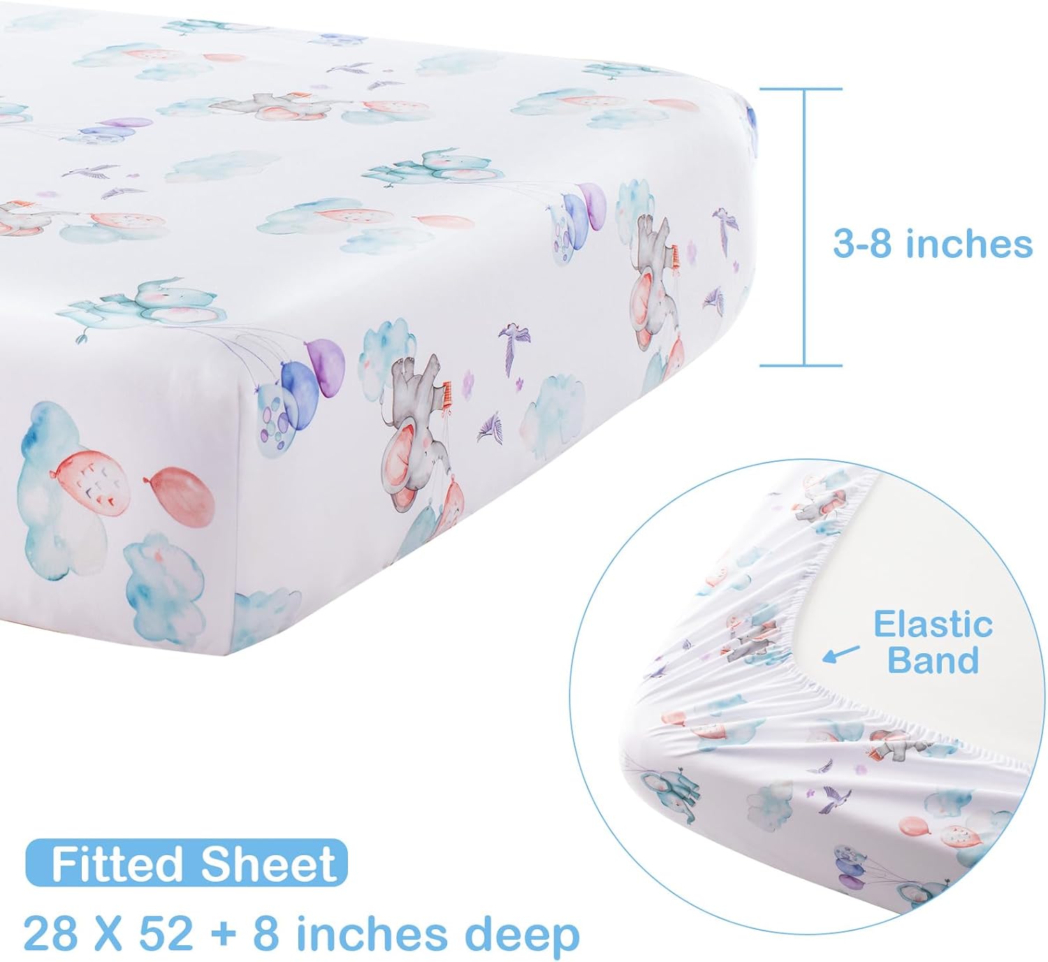- Soft Crib Sheet: The fitted crib sheet design is 28 x 52 inches and 8 inches deep pocket can perfectly fit the standard crib mattresses. There are small cartoon prints of the same theme as the quilt on it. Equipped with elastic bands that can snugly wrap around the crib mattress, not loose, but flat, keep the crib sheet in place when baby roll or crawl on the mattress. Easy to put on and off for changing and washing. Simple to use but comfortable and cozy enough for daily baby care.
