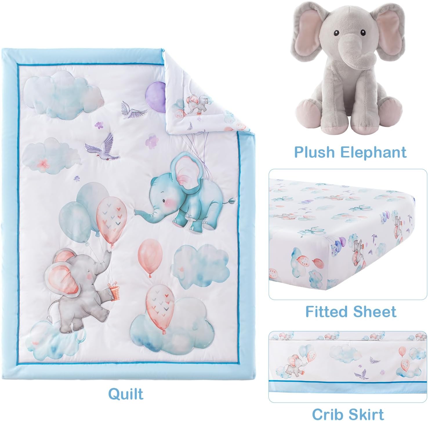 4 Piece Crib Bedding Set for Boys Girls, Infant Toddler Nursery Baby Bedding Sets Includes Cartoon Quilt, Fitted Crib Sheet, Crib Skirt and Plush Elephant Toy
