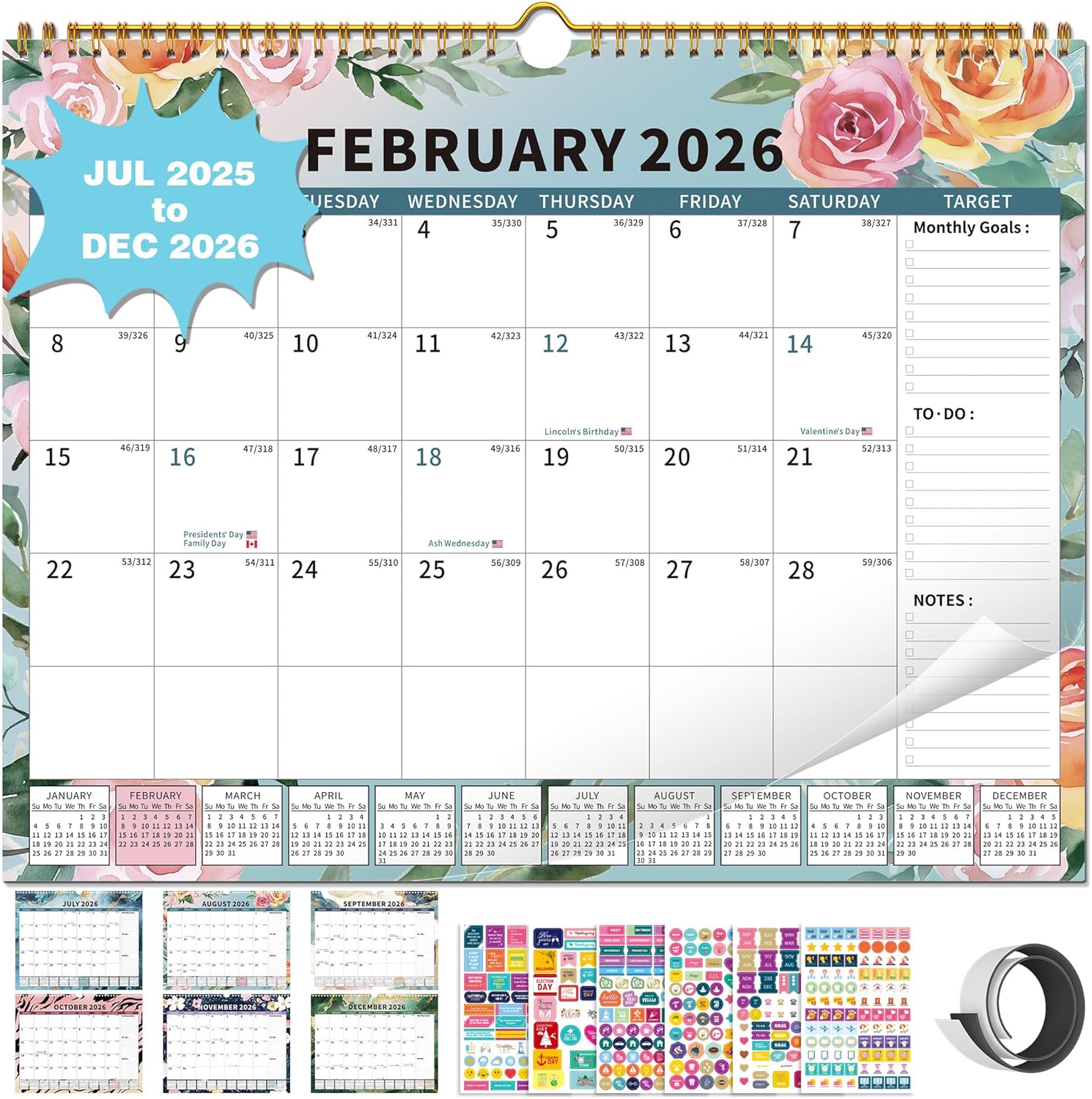 2025-2026Calendar, 18 Month Wall Calendar 2025-2026 Hanging Spiral Bound Magnetic Fridge Desk Calendars 15" x 12", Jul 2025 - Dec 2026, A- Small Rainbow