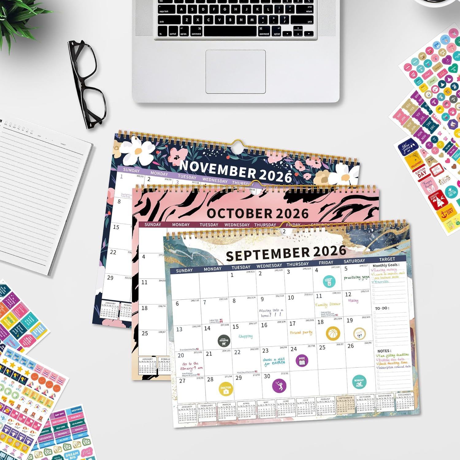 - Maximize your year with festival reminders, sticker attachments, monthly planning, and space for to-do lists