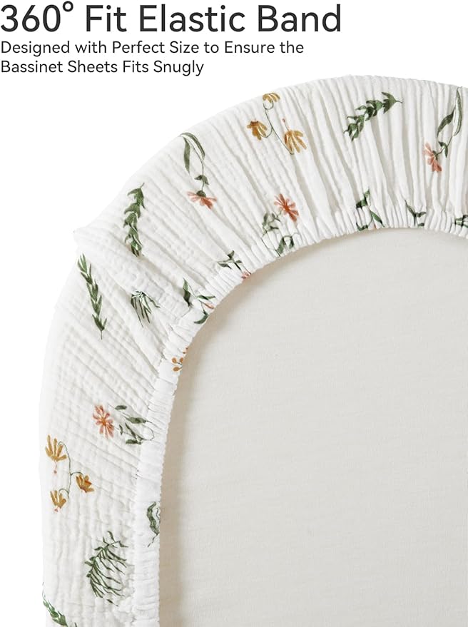 TILLYOU Muslin Bassinet Sheets for Baby Boys Girls 3 Pack, Soft Breathable Elastic Cotton Bassinet Mattress Sheets, Fit Hourglass Oval Rectangle Cradle Mattress, 33"X17",Daisy