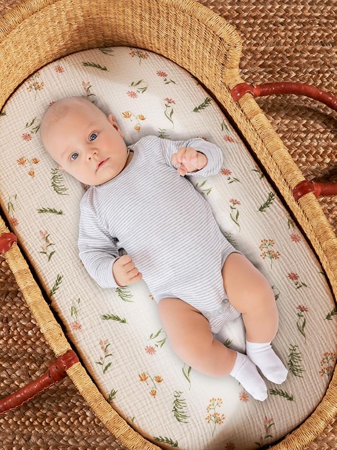 - SOFT NATURAL COZY: TILLYOU baby bassinet sheets are crafted from breathable 100% cotton muslin, offering a luxuriously soft and lightweight feel that's gentle against your baby's delicate skin. Our natural, chemical-free dyes ensure the fabric is hypoallergenic, odorless.Provide a safe and cozy sleeping environment for your baby.