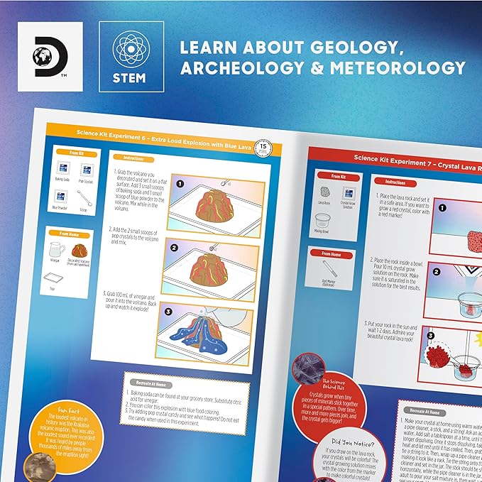- ✔ LEARN THROUGH LAVA, SLIME & SNOW – Build and erupt a volcano, make black tar and lava slime, grow crystal lava rocks, create instant snow, and simulate water tornadoes.