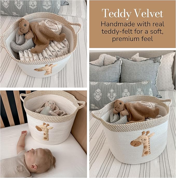 Giraffe Storage Basket for Nursery – Large 15”x11” Cotton Rope Bin with Soft Felt Animal Patch – Toy Organizer, Baby Laundry Hamper, Diaper & Towel Holder – Foldable, Washable & Baby-Safe