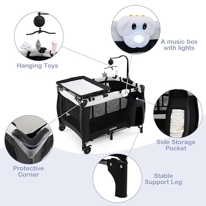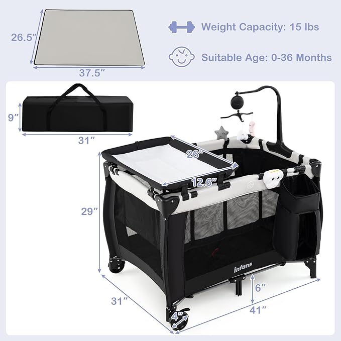 - Multi-functional Baby Crib: The 3-in-1 infant crib can be used as a playpen, bassinet and changing table. The crib comes with a side bag for diaper. The versatile design provides convenience and practicality for parents, while the kids playpen accompanies your baby’s growth. (Suitable Mattress Pad's Size: 37.5”L x 26.5”W)