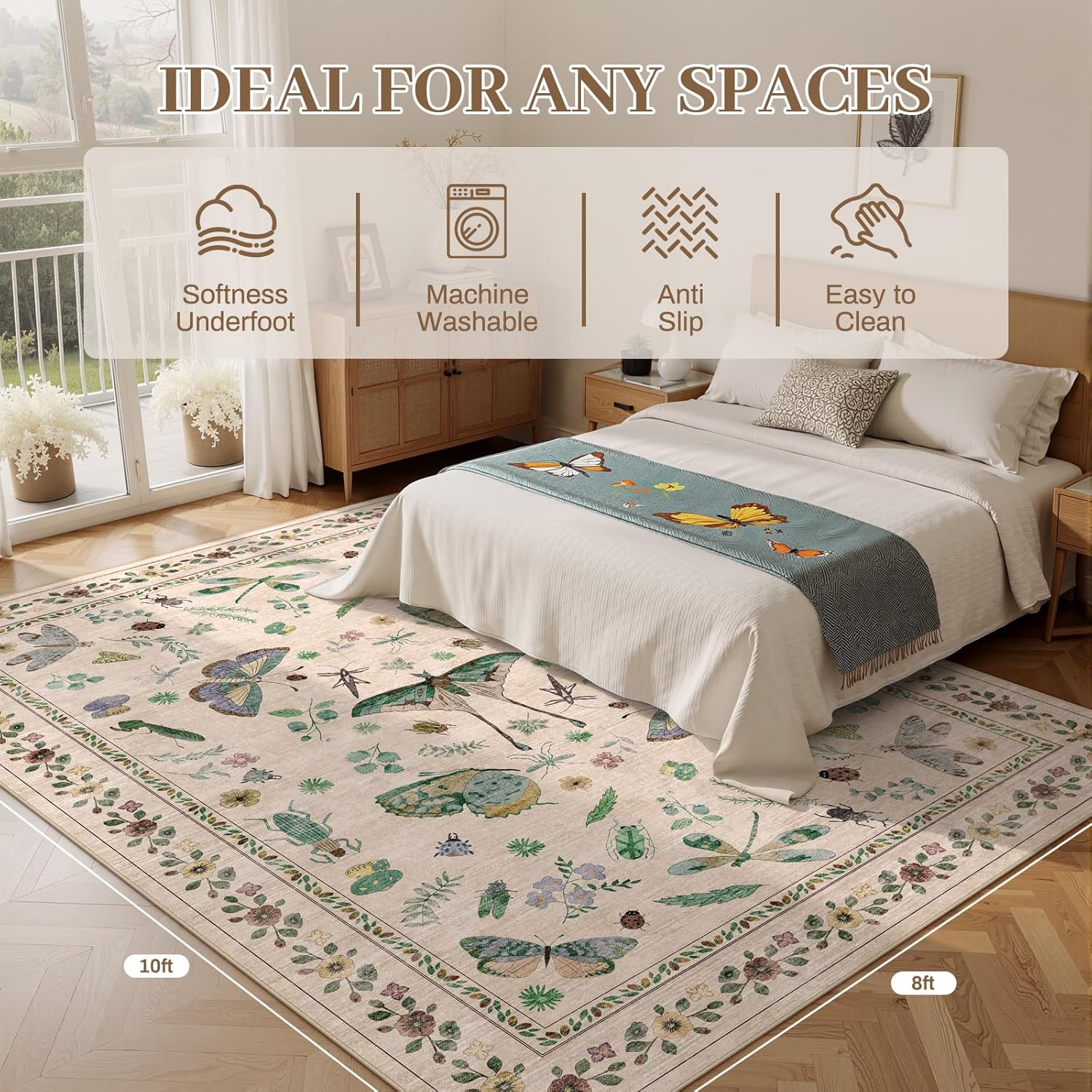 - Nature-Inspired Artistic Decor: Featuring intricate insect and botanical patterns, the Large Area Rug 8x10 adds unique natural charm to any room. Its slim profile easily slides under furniture, making it versatile for bedroom, Kids Nursery, or dining room