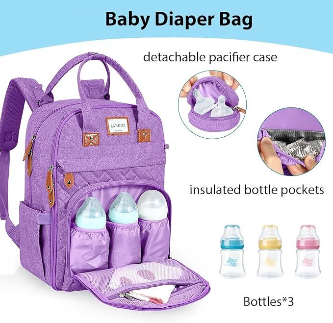 LANDICI Diaper Bag Backpack, Multifunction Baby Diaper Bags with Changing Pad, Stroller Straps & Pacifier Case, Travel Essentials Back Pack for Mom Dad Boy Girl, Large Capacity, Waterproof, Lavender