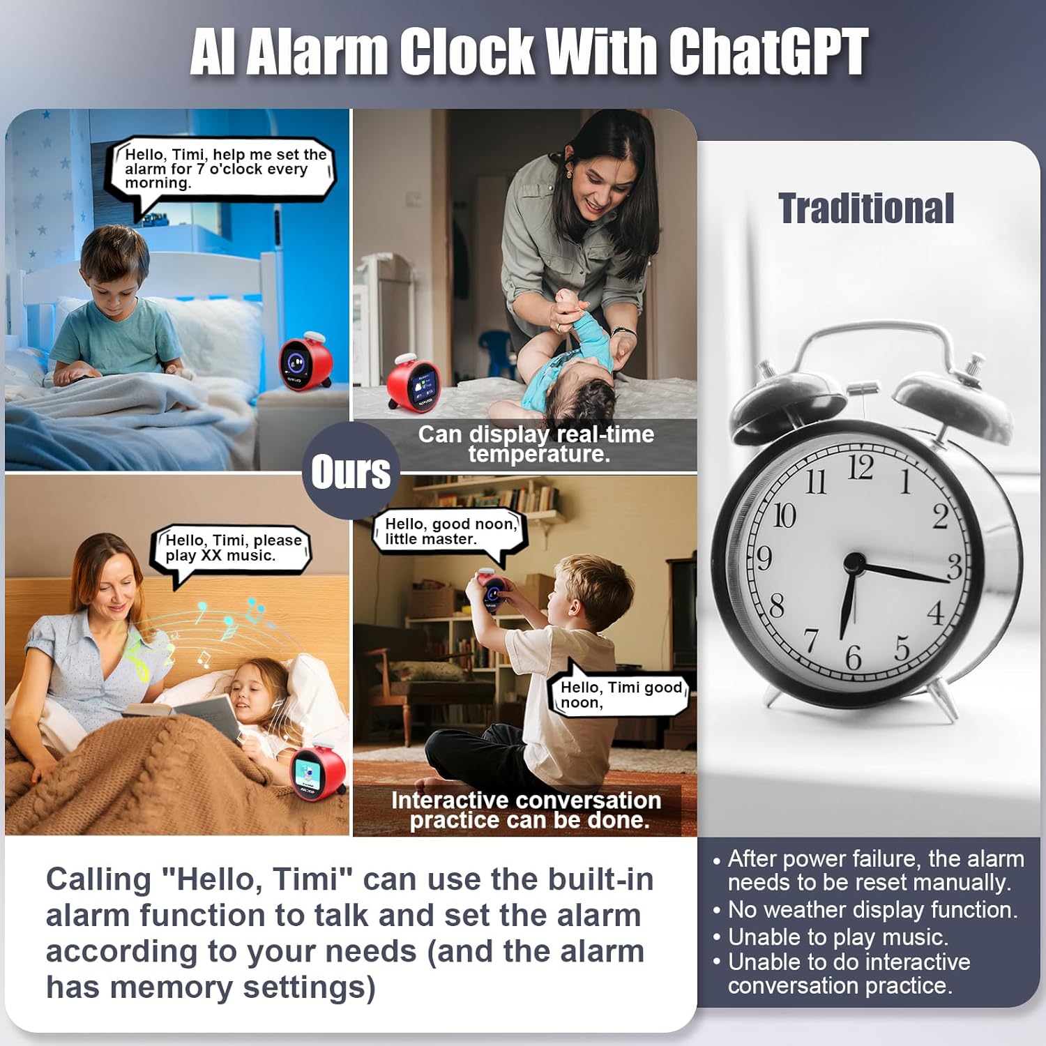 - [Intelligent AI Voice Assistant] This kids smart alarm clock is integrated with a large model database similar to Chat GPT and wakes up via the wake word “Helo Timi”. Children can easily set alarms by voice, check the weather, chat, listen to stories, and enjoy intimate emotional companionship, satisfying children's curiosity and companionship needs.