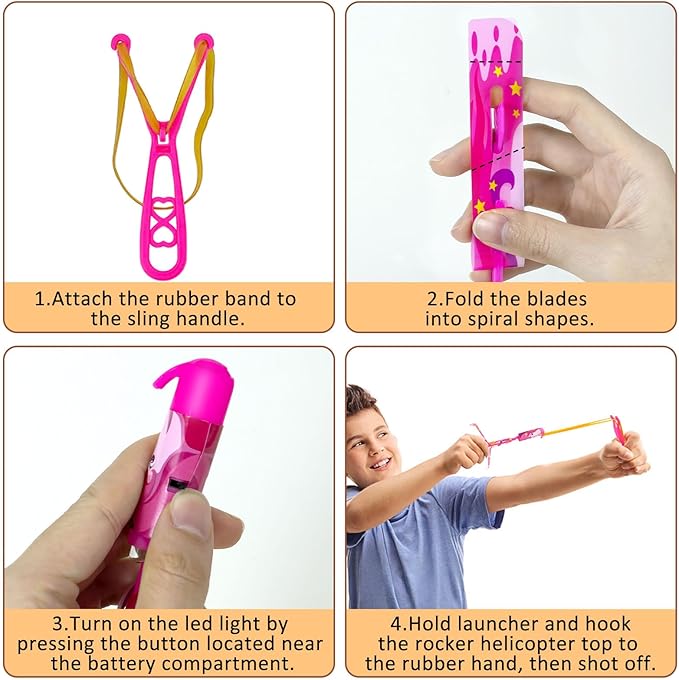 - 🚀【Easy to Assemble & Good for Outdoors】Safe enough for children. How to use: The first one—connect the rubber band to the sling handle. The second folding strap flips the lid to slightly turn on the LED lights. Third, pull the sling helicopter back, twisting the wrist all the way back. The fourth goal, let go! Play anytime, anywhere, improve children's hands-on ability, bring more fun and keep them active. When you shoot it into the air, its wings will open, and it will slowly spin and fall.