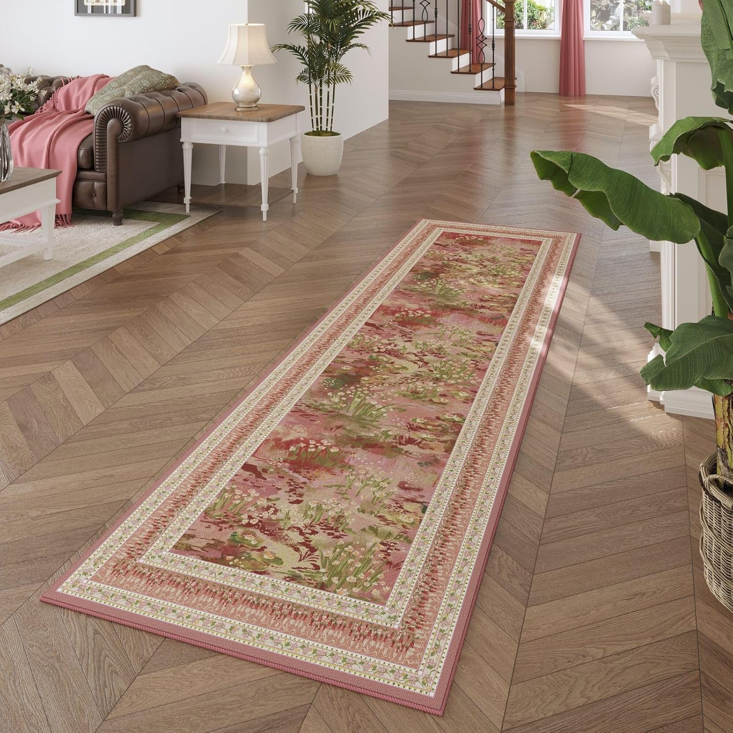 2x6 Runner Rug Impressionist-Style Vintage Kitchen Rugs Non Slip Washable Soft Carpet Runner for Kitchen Laundry Bedroom Bathroom, Pink