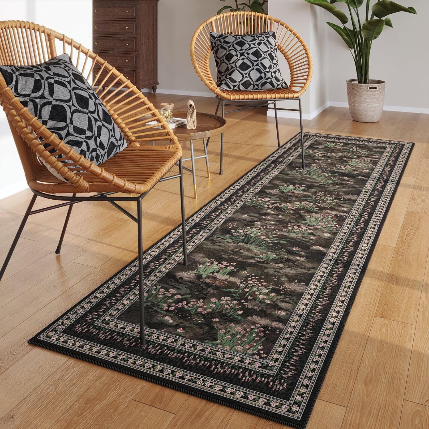 2x6 Runner Rug Impressionist-Style Vintage Kitchen Rugs Non Slip Washable Soft Carpet Runner for Kitchen Laundry Bedroom Bathroom, Black