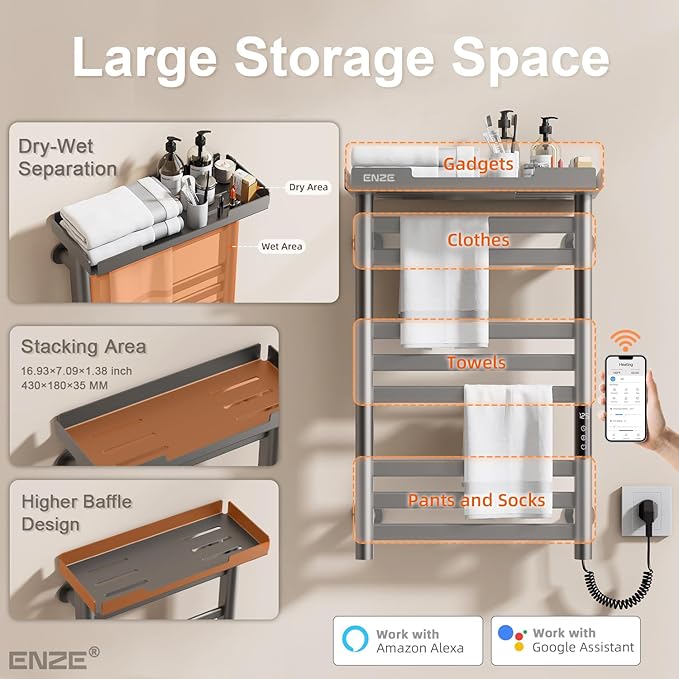 ENZE Heated Towel Rack with Shelf and Wi-Fi App Control, 8 Bars Electric Wall Mounted Towel Warmer with Timer & Adjustable Temperature, Low Carbon Steel, Plug-in/Hardwired, Gray