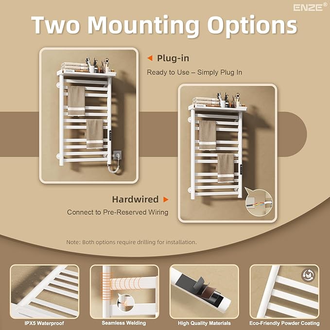 - 【Flexible Installation: Plug-in/Hardwired】 Whether you're retrofitting or renovating, this unit supports both plug-in towel warmer bars and hardwired towel warmer installations. Made of eco-coated low carbon steel, it’s a durable heated towel rack for bathroom, ideal as a wall-mounted heated towel rack or towel bar warmer for bathroom.