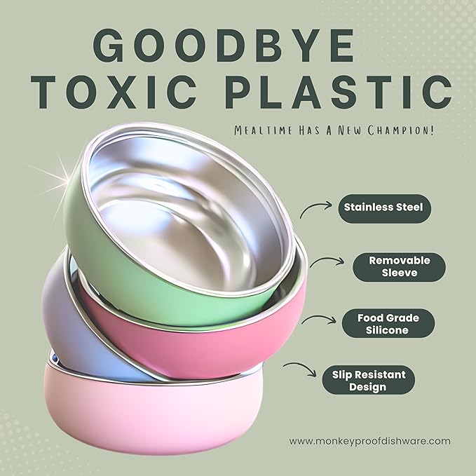 - WORRY AND HASSLE FREE: Monkey Proof stainless and silicone bowls won’t shatter like glass, leach toxic chemicals into your kids food like plastic and bamboo, or fly off the table and clatter like regular stainless steel dishes. These bowls are easy to clean (Dishwasher Safe), stain resistant, and unbreakable!