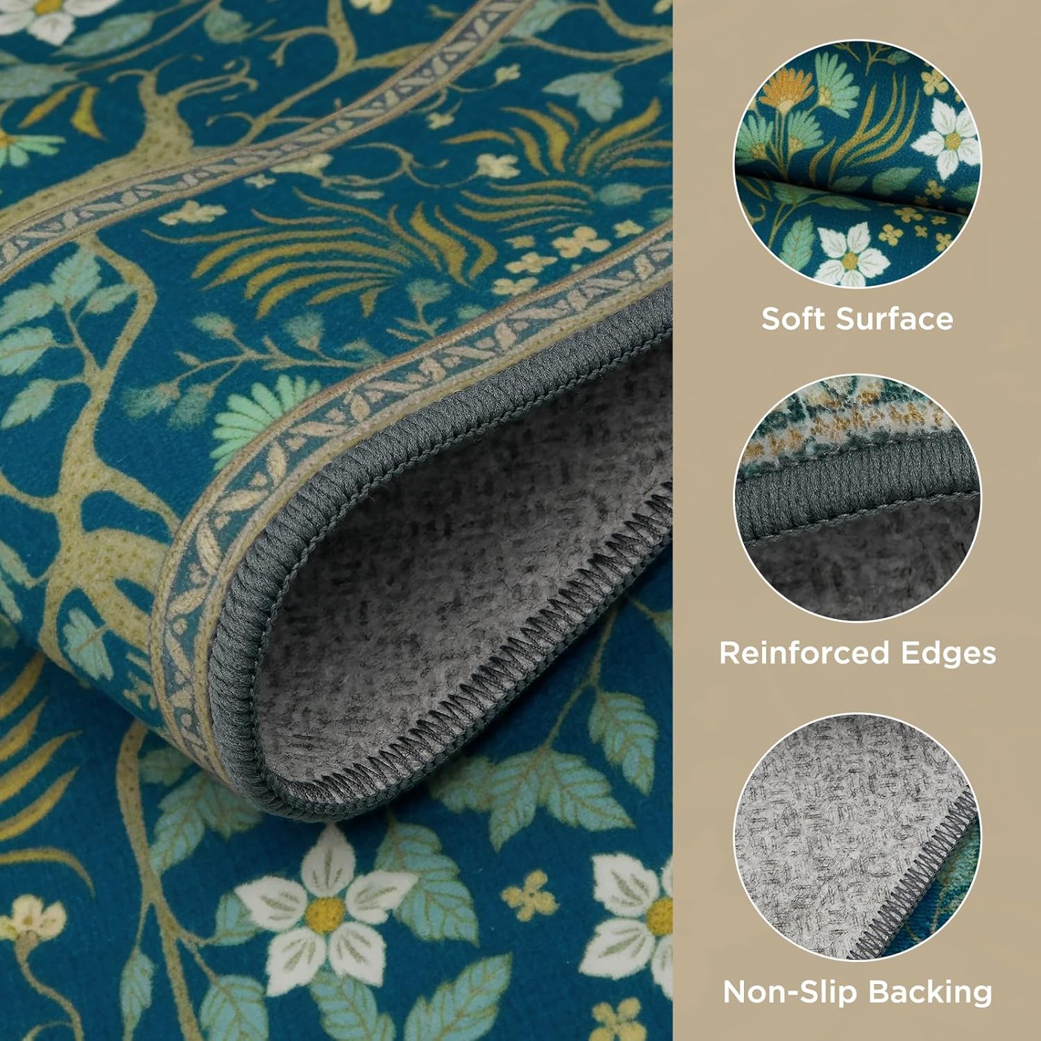 Joydeco Washable Large Area Rug 8x10, Boho Floral Rugs for Living Room Non Slip, Soft Low-Pile Botanical Forest Indoor Floor Throw Carpet for Dining Home Office Playroom, Dark Blue