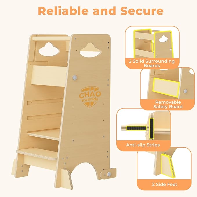 - Durable & Safe for Active Toddlers:Crafted from high-quality, child-safe materials, this tower is built to last. Its sturdy frame supports up to 220 lbs, while the non-slip feet and widened base design provide enhanced stability—so your little one can climb, learn, and play with confidence.