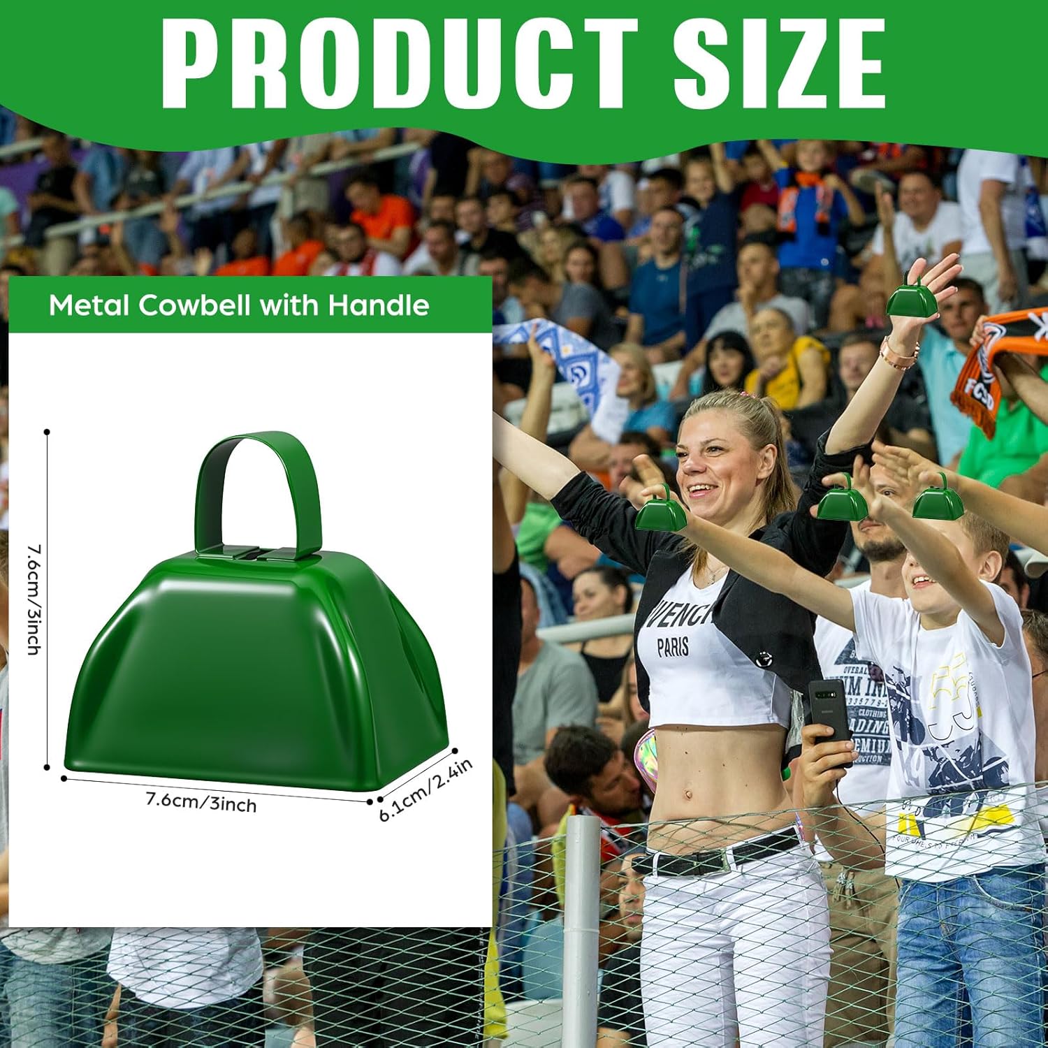 6 Pcs 3 Inch Metal Cowbells Noise Maker Hand Percussion Cow Bells with Handles for Sporting Events Cheering Noisemakers Weddings Team Spirit Sports Party Favors (Green)
