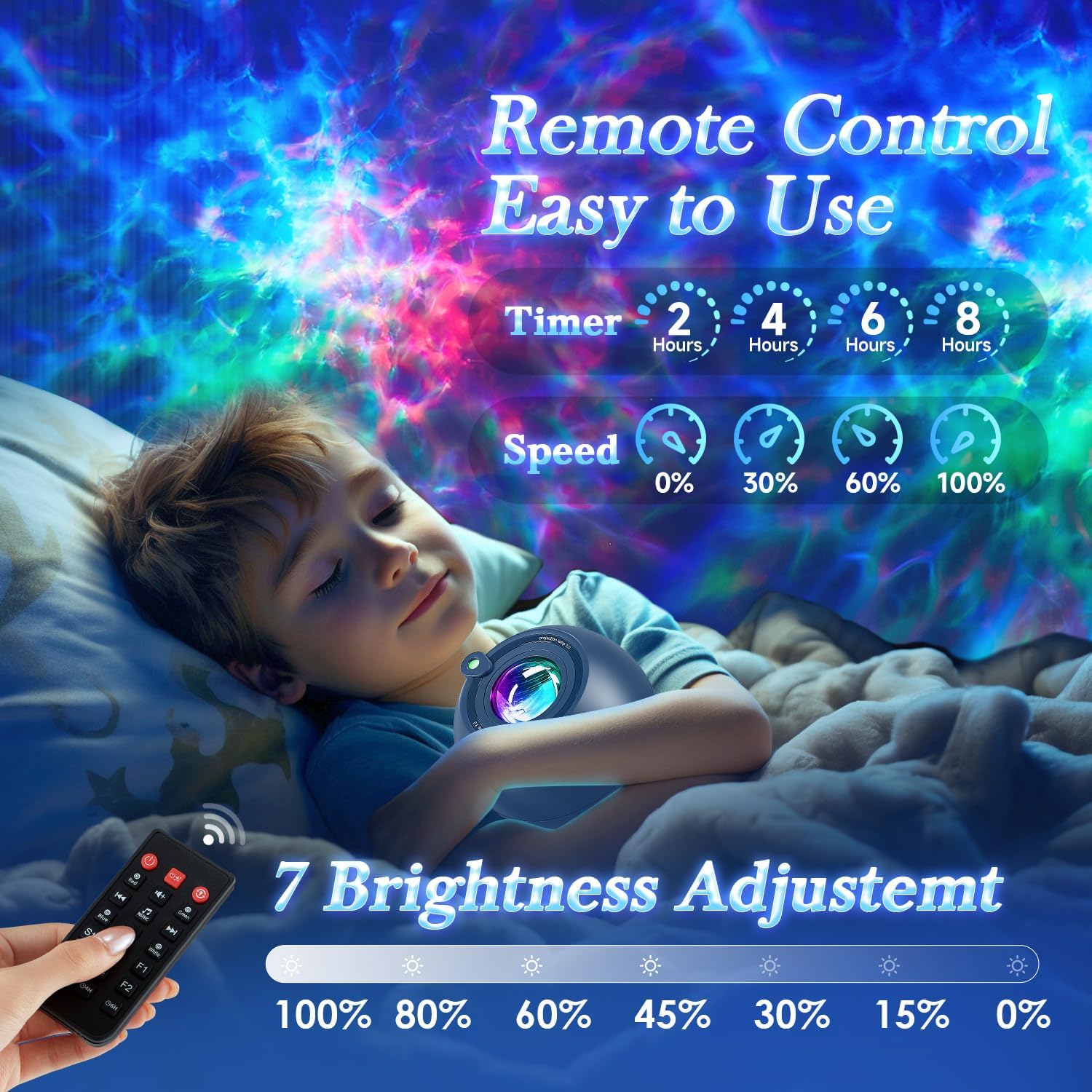 - 【AUTO TIMER+REMOTE】Galaxy Projector lights for bedroom & stars for ceiling is equipped with a remote control, which can easily control the brightness and the timer.When u try to fall asleep,don't worry about the star projector galaxy light projector for bedroom & star projector for ceiling for adults & galaxy projector lights for bedroom being on all night. U can set it to turn off after 0.5/1/1.5h.The star projector galaxy light projector for bedroom & star projector for kids & star lights for ceiling projector creates cool lights!(Tip: To protect the LED chips, the star lights for ceiling projector & star projector galaxy light & nebula projector will automatically turn off after 8 hrs.)