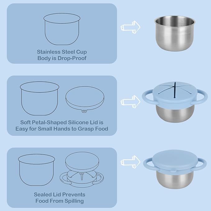 - 3-In-1 Spill-Proof Design: Our toddler snack cups no spill features a unique 3-in-1 design, specially designed for busy toddlers and even busier parents. It comes with a durable stainless steel base and a soft petal-shaped silicone lid, allowing little hands to easily grab snacks and preventing food from spilling everywhere. The included leak-proof travel lid locks in freshness and prevents leaks—no more worrying about messes on the couch, in the car, or in your bag!