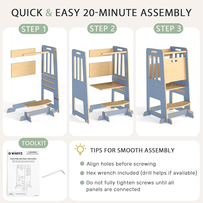 - Quick & Hassle-Free Assembly: Say goodbye to complicated setups! With numbered parts and included tools, this stool can be fully assembled in about 20 minutes by following the simple instructions. Pro tip: Each stool comes with adjustable bottom foot pads—if your floor isn't perfectly even, just tweak them for a stable, wobble-free finish. Easy, fast, and ready for your little helper to climb safely!