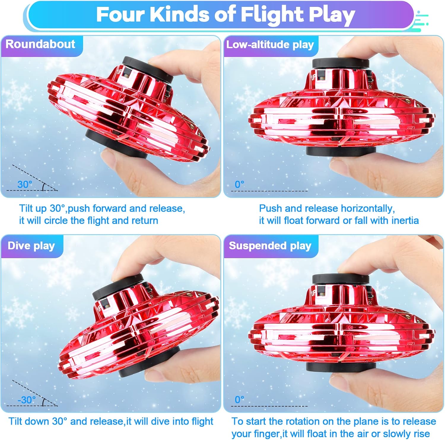 - 😊【FUN and SIMPLE UFO DRONE FLYING TOY】Turn on the power button of flying toys,hold down the center axis to rotate the wheel to start,then throw it away and fly.Different throwing speeds and angles allow different flight paths,tricks,and high-speed maneuvers.Stop the flying by grabbing the mini drone with your hand.You can have fun with friends, family,colleagues indoors,outdoors,at school and in the office.Hover toy is a popular social game at birthday parties,family gatherings.