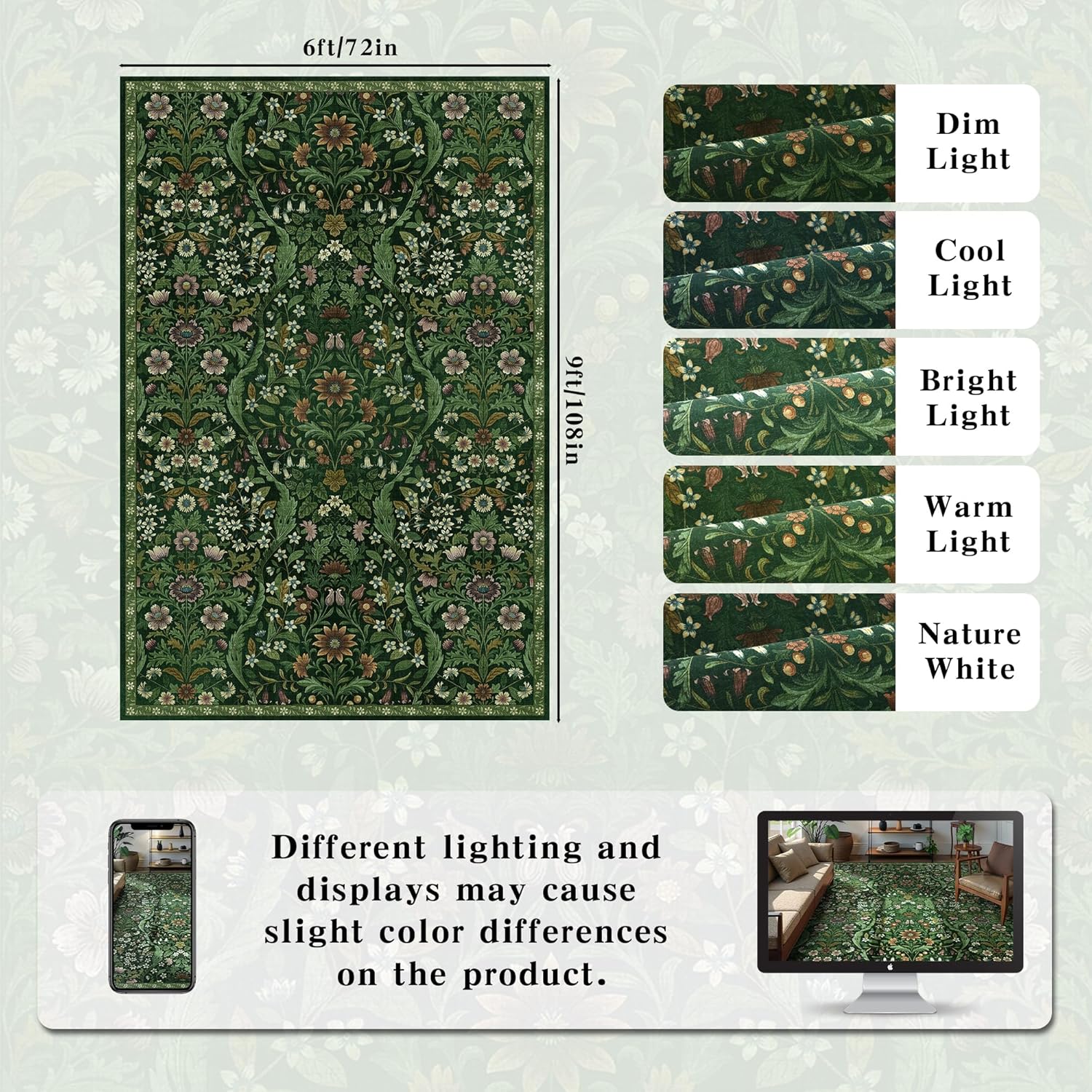 Floral Washable 6x9 Area Rug,Dark Green Boho Rugs for Living Room, Soft Low-Pile Non-Slip Stain Resistant & Non-Shedding Carpet for Bedroom, Dining Room, Office, Entryway, Nursery