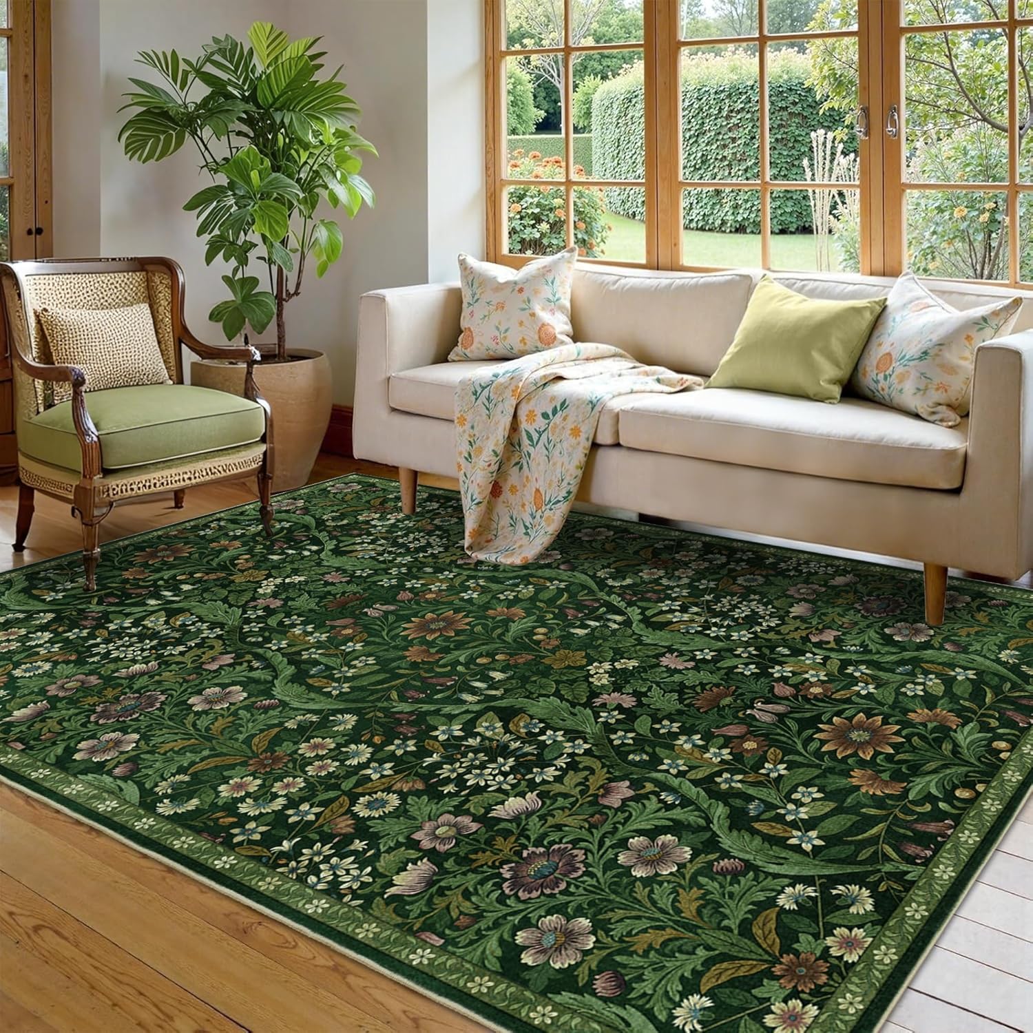5×7 Dark Green Washable Floral Area Rug,Vintage Boho Soft Low-Pile Living Room Rugs, Stain Resistant Botanical Non-Slip Carpet for Bedroom,Dining Room, Kids Nursery,Home Decor