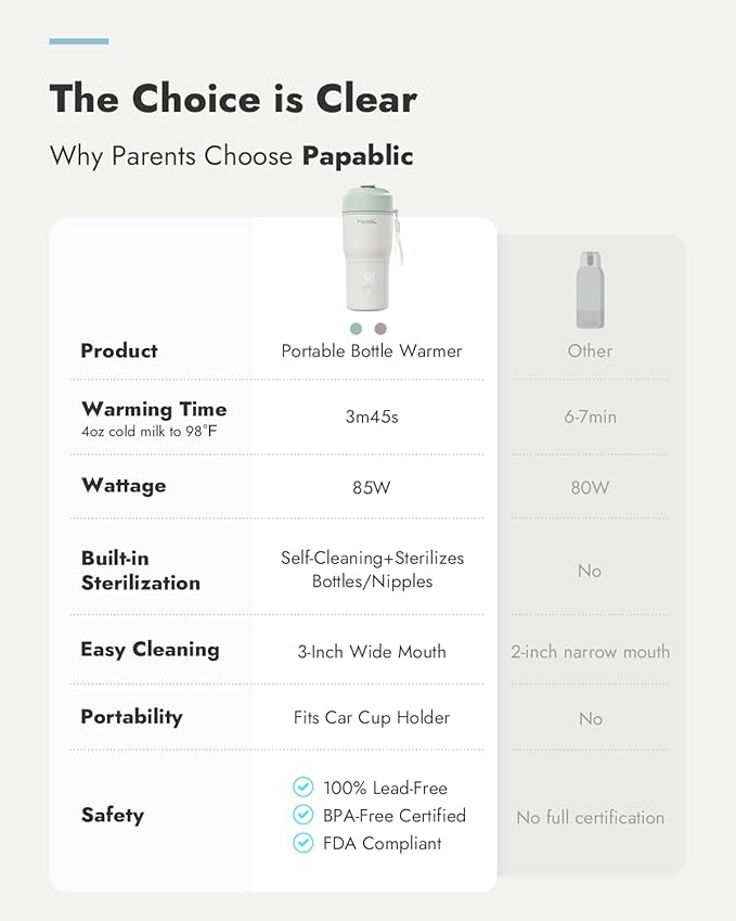 - 3-in-1 Convenience – Home & Travel: Papablic combines a traditional bottle warmer, portable bottle warmer, and portable sterilizer in one compact unit. Perfect for busy parents who want a versatile, space-saving solution.