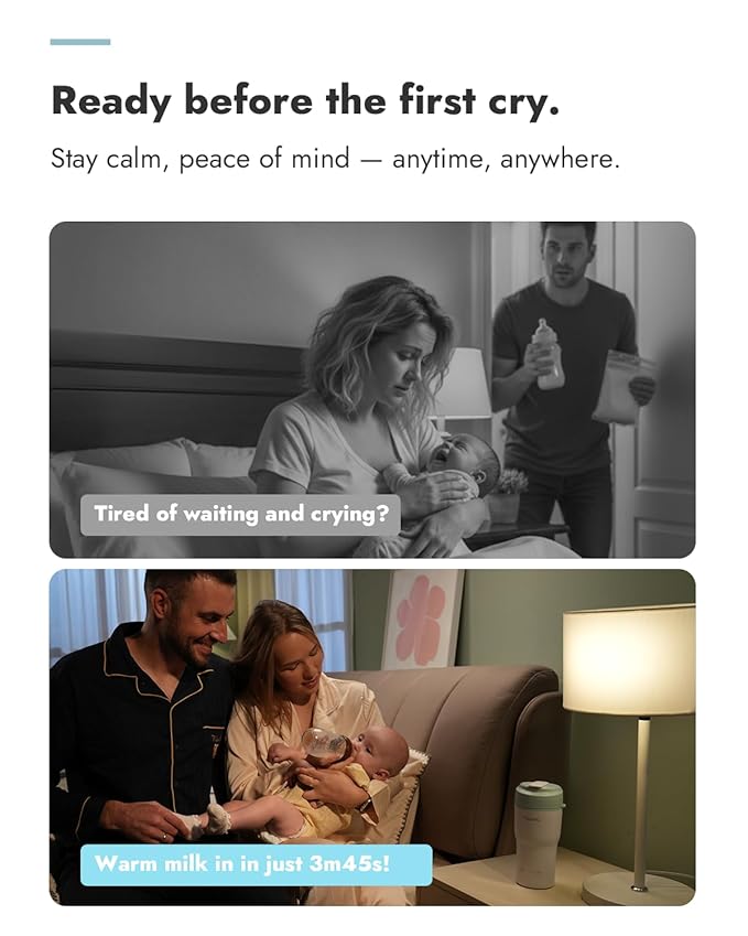 - Ultra-Fast Heating – Milk Ready in Minutes: Heats 4oz of refrigerated milk to 98℉ in just 3m45s, and 4oz of room-temp water to 104℉ in 1m35s. Perfect for portable bottle warmer for breastmilk, night feeds, or when traveling.