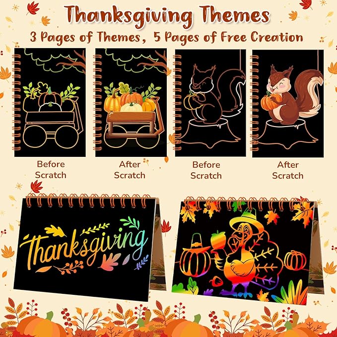 - 【Inspires Creativity & Builds Skills】Ignite your child's creativity with these fun Thanksgiving scratch art notebooks! Perfect for doodling and drawing, this mini art kit helps develop fine motor skills, hand-eye coordination, and artistic confidence. No screens, just pure creative fun—watch your little artist's ideas come to life, one scratch at a time! Plus, with a variety of themes, kids can explore their favorite animals or festivals.