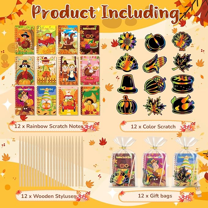 - 【12 Pack Scratch Art Party Favors】Delight young artists with these magical Thanksgiving party favors! Skrajoi rainbow scratch bundle including 12 pack Thanksgiving scratch note pads(5.5 x 3.5 inches), 12 scratch off cards with 12 wooden styluses and 12 gift bag in a box providing endless creative fun for kids. Perfect for kids ages 4-16, these colorful Thanksgiving arts books make ideal Thanksgiving party favors, classroom prizes, Easter stuffers, or gifts for birthdays.