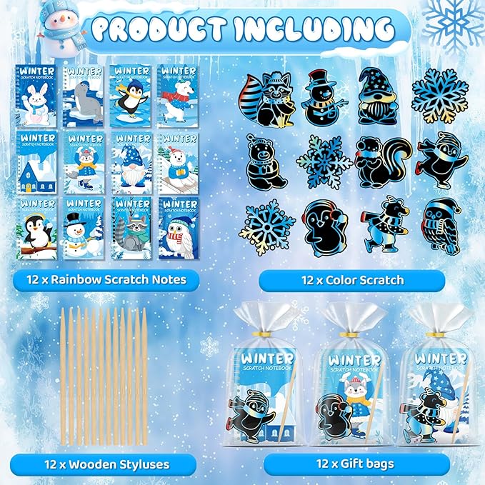 - 【12 Pack Scratch Art Party Favors】Delight young artists with these magical Winter party favors! Skrajoi rainbow scratch bundle including 12 pack Winter Theme scratch note pads(5.5 x 3.5 inches), 12 Winter tree scratch off cards with 12 wooden styluses and 12 gift bag in a box providing endless creative fun for kids. Perfect for kids ages 4-16, these colorful Winter crafts books make ideal Winter party favors, classroom prizes, Easter stuffers, or gifts for birthdays.
