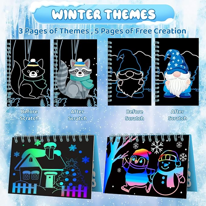 - 【Inspires Creativity & Builds Skills】Ignite your child's creativity with these fun Winter scratch art notebooks! Perfect for doodling and drawing, this mini art kit helps develop fine motor skills, hand-eye coordination, and artistic confidence. No screens, just pure creative fun—watch your little artist's ideas come to life, one scratch at a time! Plus, with a variety of themes, kids can explore their favorite animals or festivals.