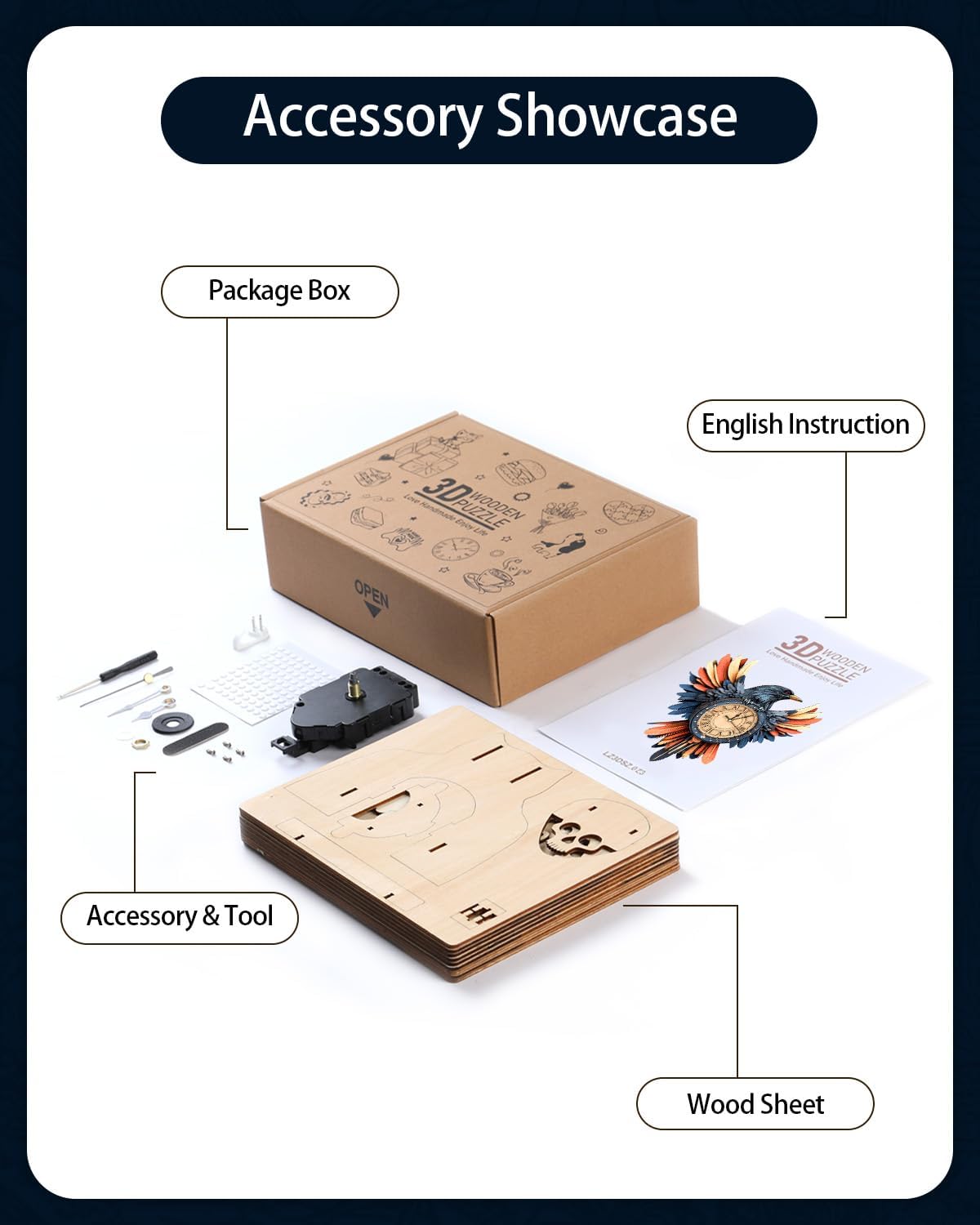 - 【Wisdom Raven Theme Clock】:This 34-piece raven-themed 3D wooden puzzle perfectly combines the wisdom and mystery of the raven with practical clock functionality, integrating natural aesthetics, whimsical creativity, and mechanical artistry. The deep blue wing textures complement the Roman numeral dial, while 3D puzzles for adults feature a detachable wooden pendulum design, making it both a collector's item for puzzle enthusiasts and an elegant accent for personalized home decor.