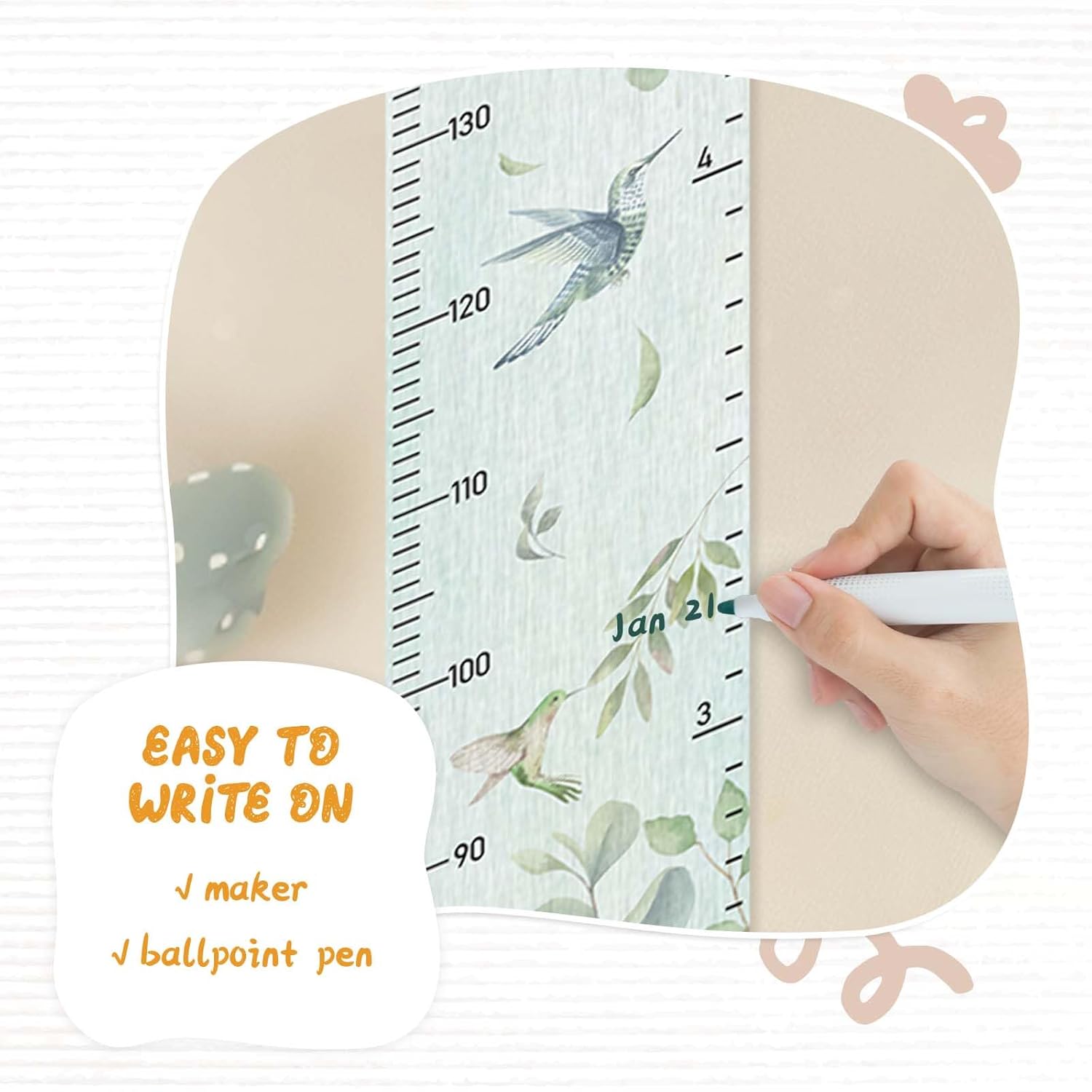 - Design: Kids growth chart with rope at the top of the chart, easy to install and removeable, foldable and portable design, easy to store, hang, roll up, transport, and save space. It boasts a material that's easy to write on, where you can use dark colored ballpoint pens and markers to track growth milestones. Our height ruler can clearly show your kids' height.