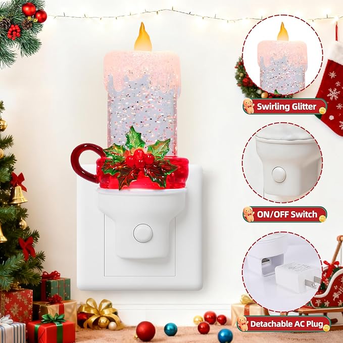 - Magical Glow for Every Space: Brighten your home with this enchanting Christmas night light, perfect for bedrooms, nurseries, hallways, kitchens, and living rooms! Its soft, swirling glitter glow creates a cozy ambiance while providing just enough light for safe nighttime navigation. The festive holiday designs add cheerful decor to any space, whether used as a wall plug-in or portable night light.