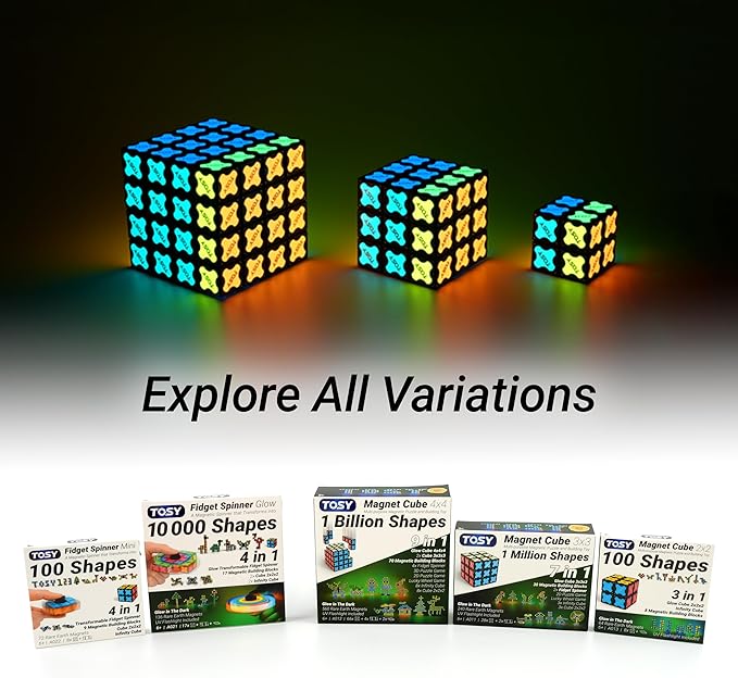 • TRANSFORMABLE FIDGET SPINNER - Featuring 136 magnets (eight embedded in each block), the TOSY Magnet Fidget Spinner Glow lets you create various fidget spinner shapes. Rotation is smooth with a stainless steel bearing, making it spin longer than others