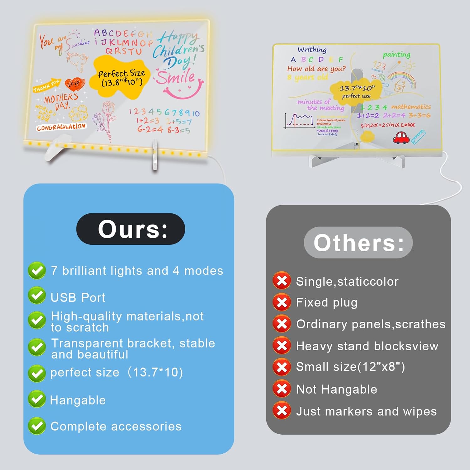 Acrylic Dry Erase Board with Light,LED Note Board with Colors 13.8"X10" 4 Modes & 7 Colors Rewritable LED Acrylic Drawing Board forKids School Home Office Include 7 pens,Clear Stand,Spray Bottle