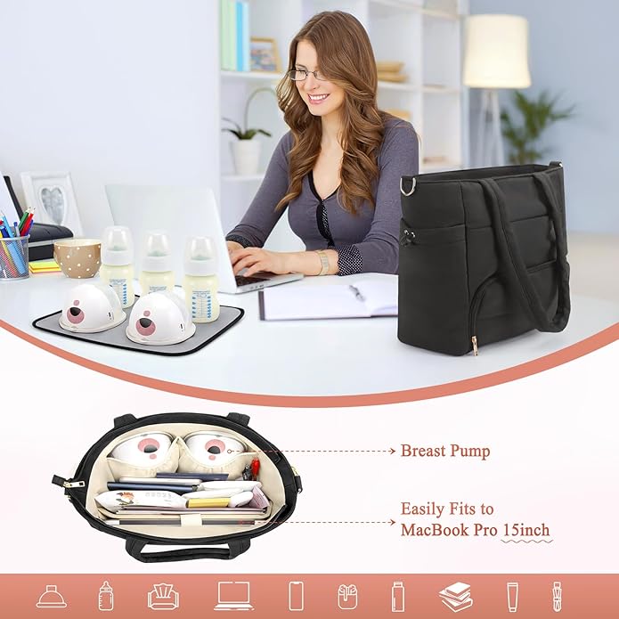 Diaper Bag Tote for Working Mom, Breastmilk Cooler Bag with Insulated Compartment, Breast Pump Tote Bag with Ice Pack for Cooler & 15‘’ Laptop Sleeve, Baby Bottle Cooler bag for Nursing, Work, Travel